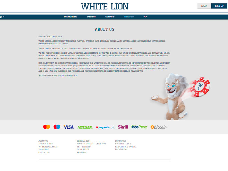 Es ist auch gut zu wissen, dass die Sicherheit der White Lion Casino Handy App nicht verhandelbar ist, was bedeutet, dass diese Plattform die neueste SSL-Verschlüsselungstechnologie verwendet, um Ihre finanziellen und persönlichen Daten frei von einem unerwünschten Blick zu bewahren. Darüber hinaus werden Fairness und Vertrauen durch die von der Regierung von Curacao ausgestellte Master-Lizenz gefördert.